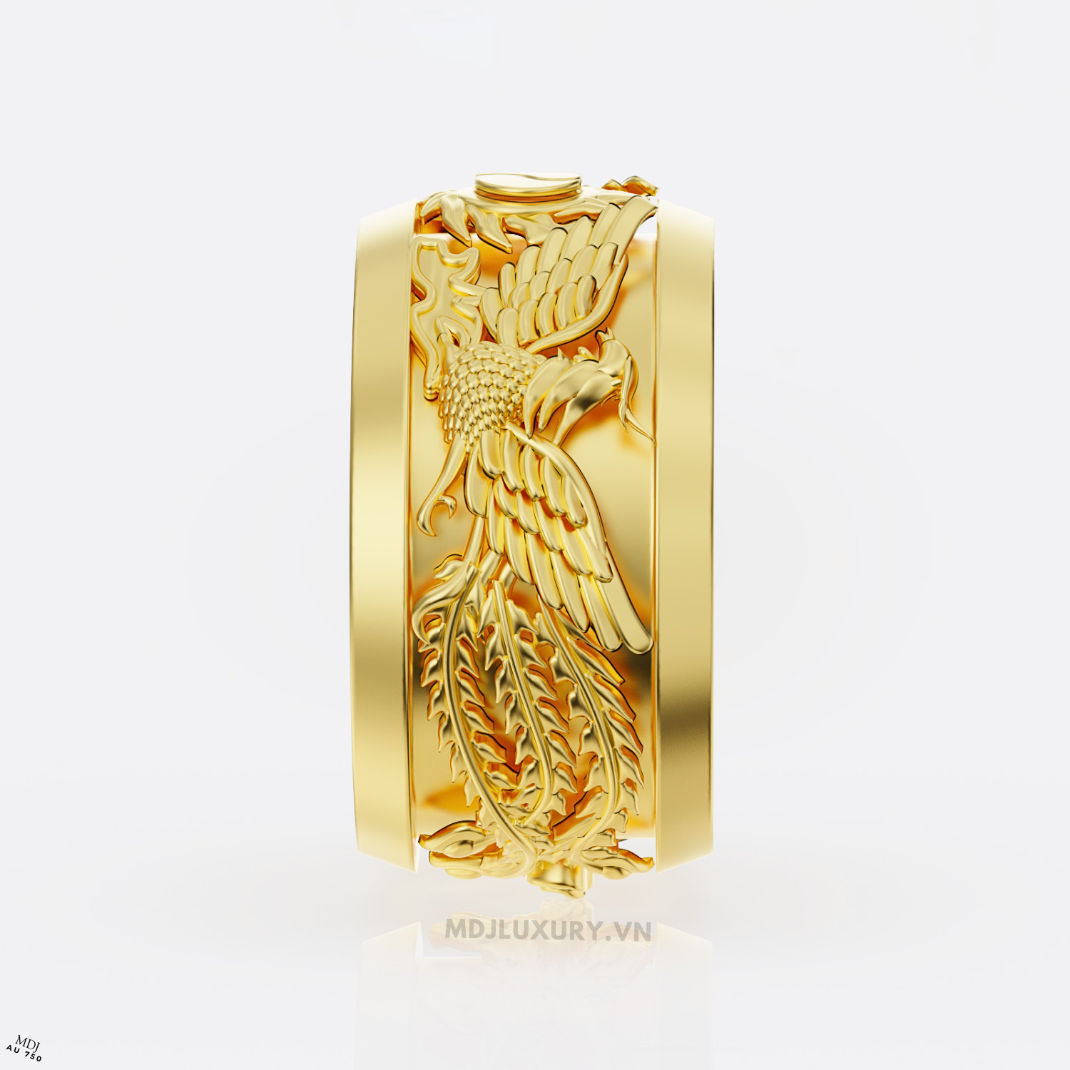 là mẫu nhẫn độc đáo mang đậm giá trị phong thủy và nghệ thuật. Được chế tác từ vàng 24K nguyên chất, sản phẩm thể hiện sự cao quý, mạnh mẽ và trường tồn. Thiết kế âm dương xoáy cùng đôi phượng mang ý nghĩa cân bằng, hòa hợp và hạnh phúc viên mãn.