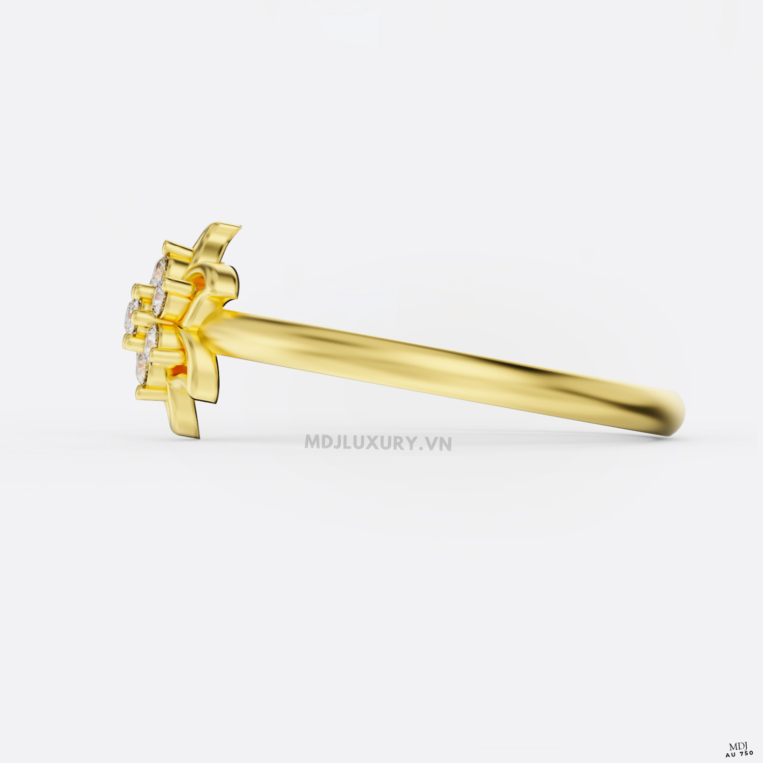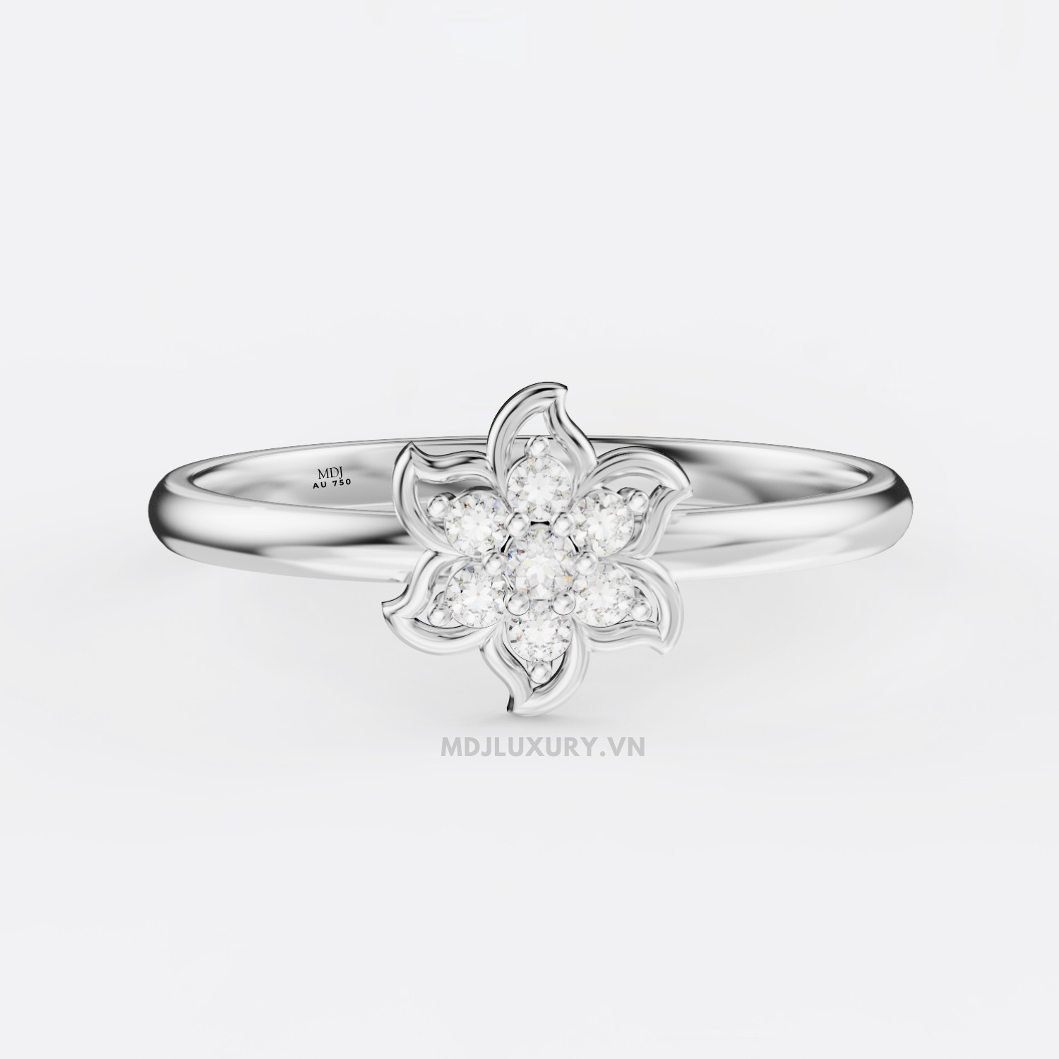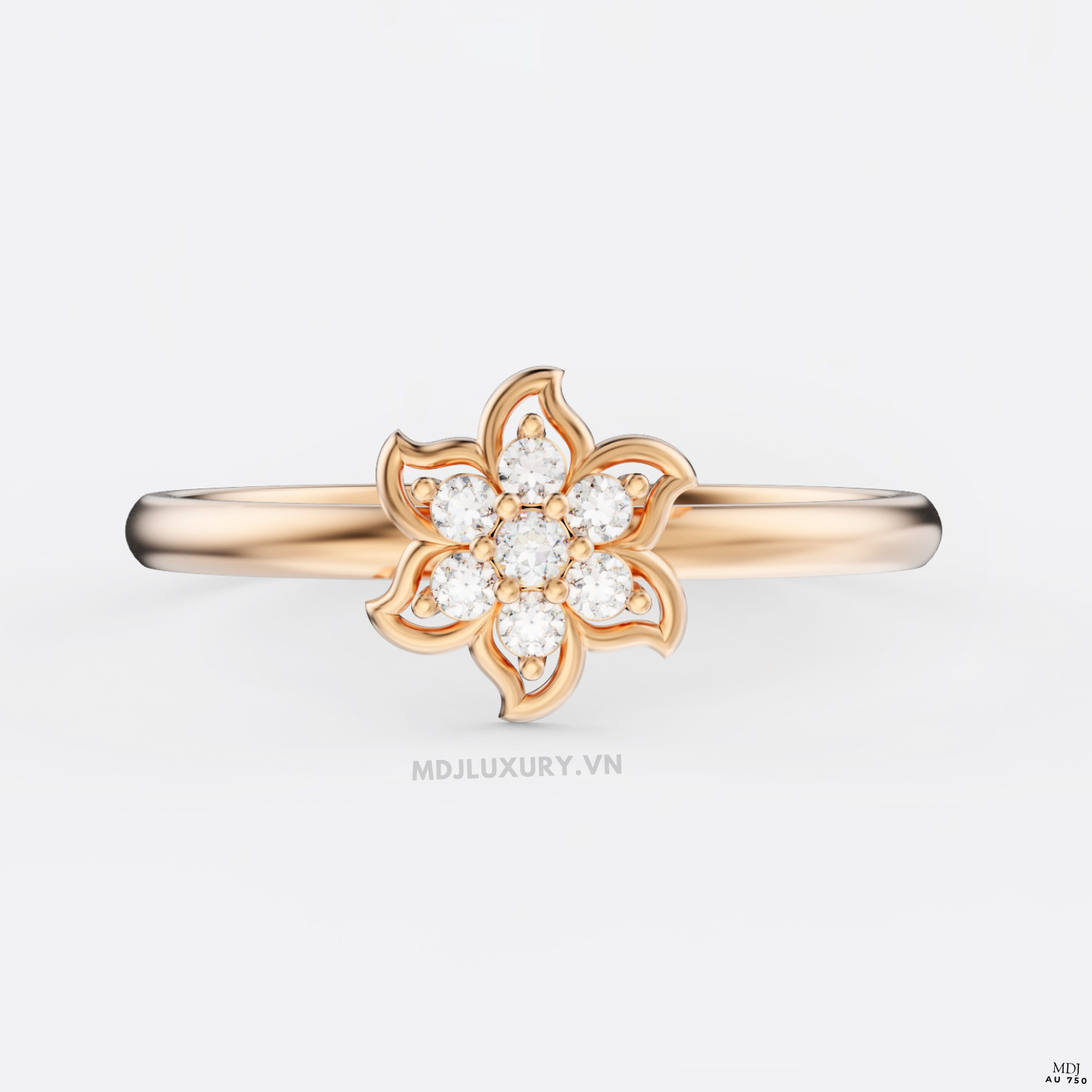 Mỗi cánh hoa trên chiếc nhẫn F023 được chế tác tỉ mỉ, mềm mại như ôm trọn viên đá quý trung tâm, biểu tượng cho sự che chở và nâng niu trong tình yêu.